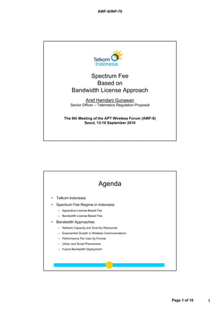 The document discusses spectrum fee approaches in Indonesia. Currently, Indonesia uses an apparatus-license-based fee structure where operators pay per transmission device. However, this may discourage network expansion. The proposed bandwidth-license-based approach charges operators based on the amount of spectrum bandwidth they license. This benefits operators expanding coverage aggressively. The document also outlines the various spectrum allocations and operators in Indonesia across various frequency bands such as 450MHz, 800MHz, 900MHz, 1800MHz, 2100MHz, 2300MHz and discusses factors influencing network capacity like bandwidth, signal-to-noise ratio and cell density.