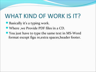 This document provides information about a typing job. It involves typing scanned PDF files into Microsoft Word format, excluding figures, headers, footers, and extra spaces. The PDF files are provided on a CD containing around 600 pages, but the Word document will be shorter at 300-350 pages after formatting. Payment of Rs. 10,000-15,000 will be provided per assignment within 1 month. To enroll, applicants must register and provide a photo ID, two passport photos, and a refundable security deposit. The work involves opening the PDF and Word files simultaneously and typing the text from PDF to Word.
