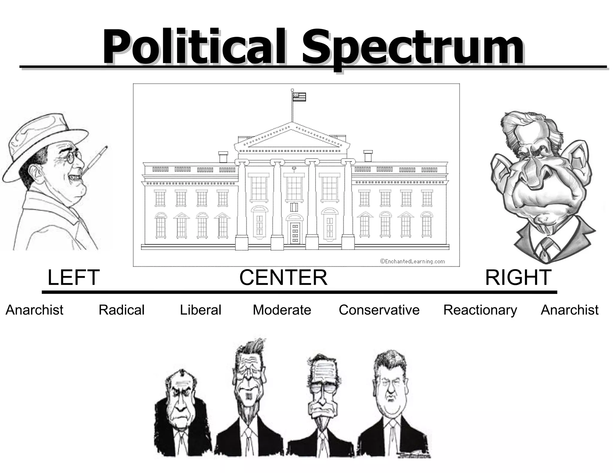 The document outlines different positions on the political spectrum from left to right. It describes anarchism as demanding the end of government, capitalism and religion through direct action and violence. Radicals are described as supporting socialist ideas through revolutionary means. Liberals are described as trusting government to reform society through policies promoting equality, regulation and social welfare. Moderates are described as valuing compromise and problem solving over ideology. Conservatives are described as seeking to preserve tradition and being skeptical of change, while reactionaries demand a return to past ideals through extreme nationalism, authority and intolerance of differences.