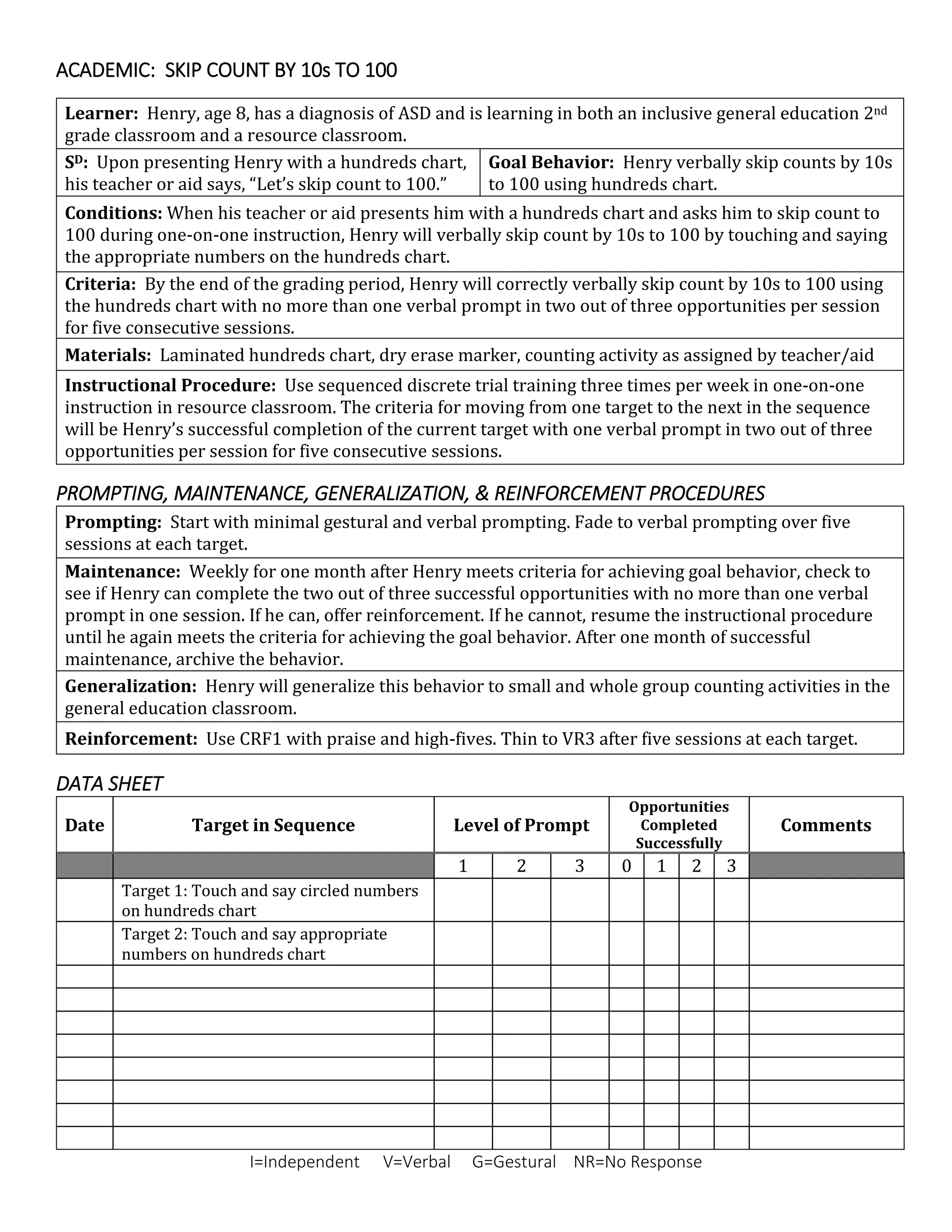 This document outlines goals and procedures for teaching several skills to students with autism spectrum disorder. It includes goals for a student to learn to skip count by 10s to 100 using a hundreds chart, write complete simple sentences, request a sensory break using a picture symbol, ask to go to the bathroom verbally and with sign language, and wash hands before eating snack. The document provides details on instructional procedures, prompting hierarchies, data collection, maintenance and generalization for each goal.