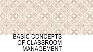 The document outlines key components of classroom management, emphasizing the importance of organization and the six main components: physical, psychosocial, behavioral, instructional, procedural, and organizational. It highlights the challenges of maintaining discipline, especially in special education, and the necessity of rules and procedures to manage classroom order. Additionally, it discusses the dynamic characteristics of classroom settings and the unpredictable nature of teaching environments.