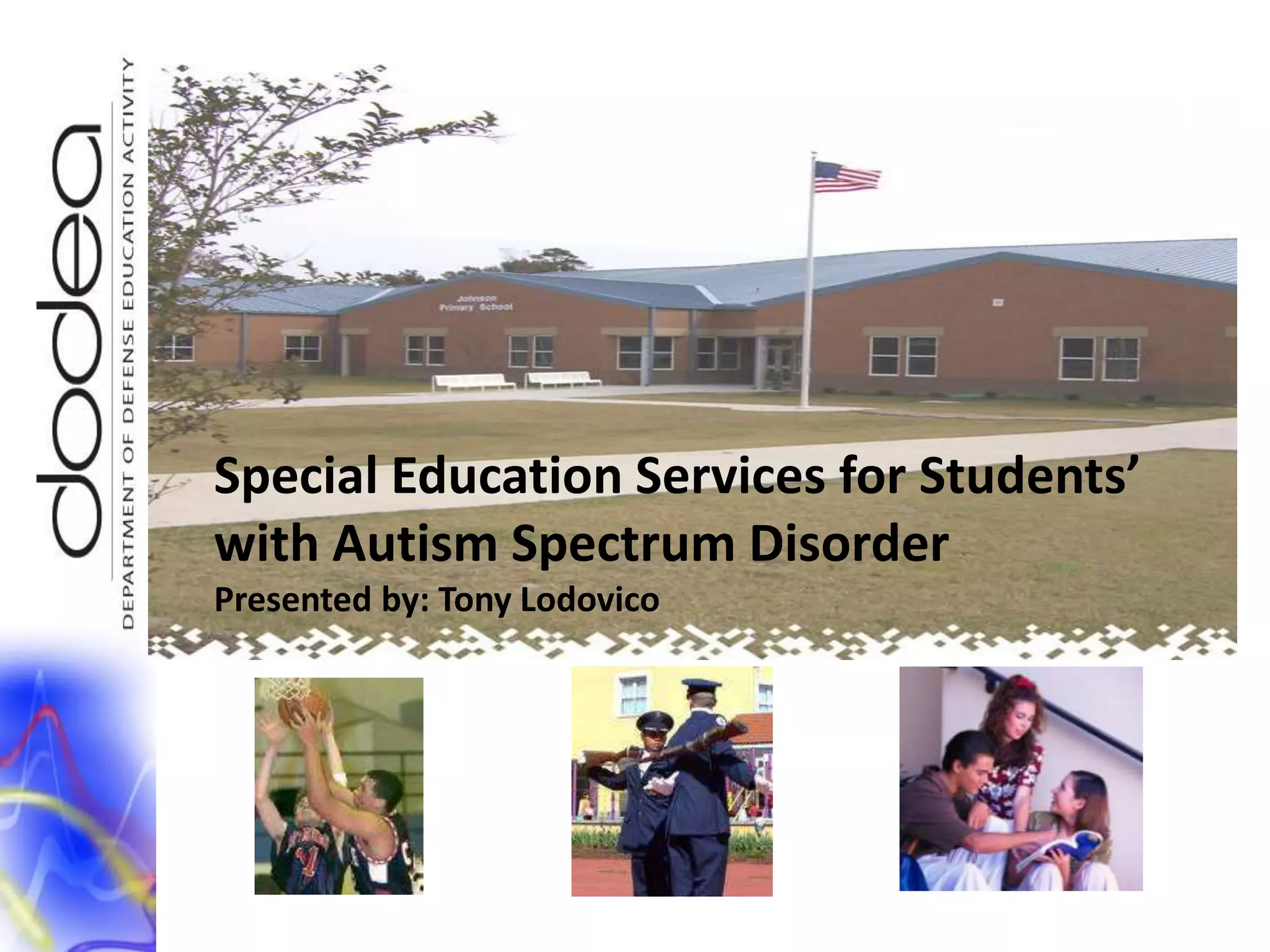 This document discusses special education services for students with autism spectrum disorder in the Department of Defense Education Activity (DoDEA) school system. It provides the following key points: