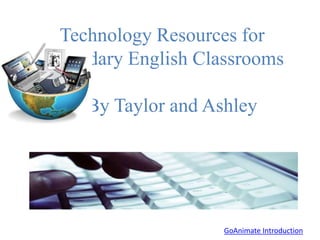 This document provides summaries of various educational technology resources for secondary English classrooms, including Google Drive, Brain Pop, Quizlet, Read Write Think, Grammar Gorillas, PBS Learning Media, Grammar Bytes, and Voki. Each resource is summarized in 1-2 sentences describing its purpose and functionality. The document also includes potential connections between each resource and the Universal Design for Learning principles and guidelines.