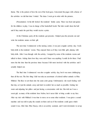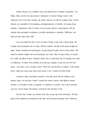 Mindy Akins volunteered at a nursing home for her senior project, where she witnessed activity directors providing entertainment and social activities to improve residents' well-being. She helped with events like a fall festival and Christmas party. Mindy encountered challenges like an unhelpful project facilitator and restrictions on photographing residents, but was able to work around these issues. Through this experience, Mindy learned about the important role of activity directors and realized she wants to work with the elderly as a social worker rather than in a nursing home setting. She encourages others to volunteer their time to help older adults.