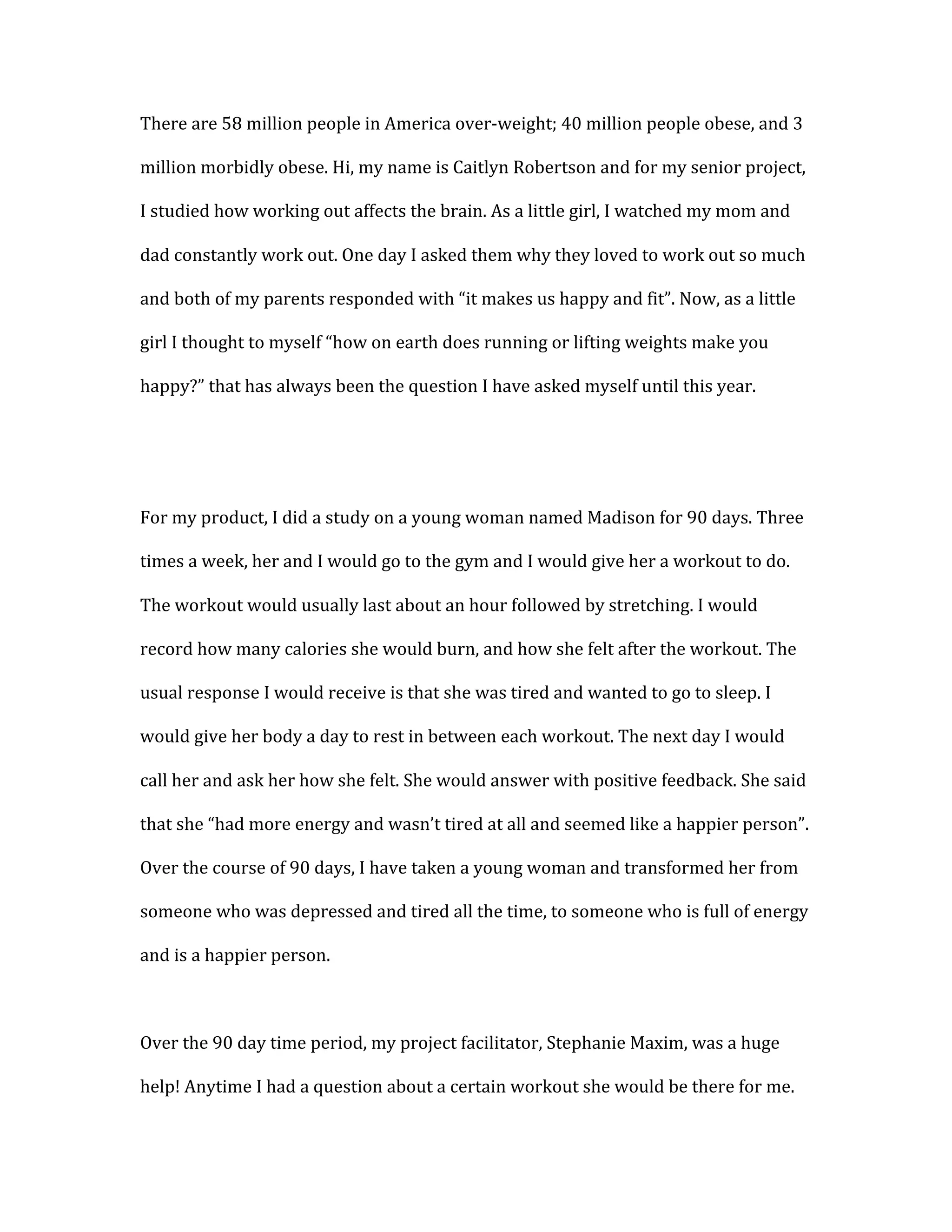 Caitlyn Robertson conducted a 90-day study on a young woman named Madison to understand how working out affects mood and energy levels. She worked out with Madison three times a week, recording calories burned and how Madison felt afterward. Initially Madison reported being tired and depressed, but over the course of the study began feeling happier with more energy on non-workout days. Robertson concluded that regular exercise can transform someone who feels tired and depressed into a happier, more energetic person.