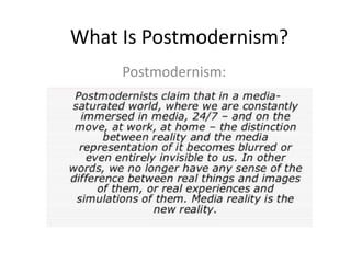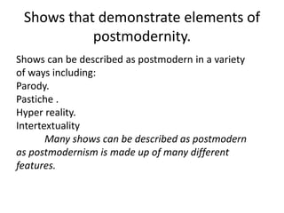 The Mighty Boosh is a British comedy troupe featuring Julian Barratt and Noel Fielding that aired on BBC Three from 2003 to 2007. The show uses postmodern techniques like parody, pastiche, hyperreality, and intertextuality to blend genres and reference other media in spontaneous and unpredictable ways. It draws attention to its constructed nature by having the hosts directly address the audience at the beginning of episodes. The Mighty Boosh mixes and blurs genres, referencing things like music videos, fantasy, and romantic comedy to create a random and evolving storyline that keeps viewers entertained because they cannot anticipate what will happen next.