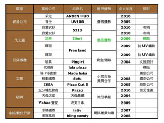 本文件分析了台灣網路服飾市場的競爭現狀和經營策略,著重於品牌定位與消費者行為的轉變。指出網路購物逐漸成為主要消費方式,並強調成功品牌需調整經營模式以符合消費者需求。最後,文件提到網站行銷的重要性,並給出一系列提升轉換率和用戶體驗的建議。
