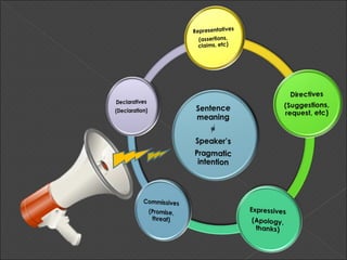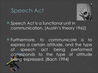 This document discusses speech acts, which are functional units of communication. It defines locutionary, illocutionary, and perlocutionary aspects of speech acts. It also discusses research methods used to study speech acts, including role plays, discourse completion tasks, and interviews. Finally, it notes the importance of teaching speech acts to language learners and recommends techniques like modeling dialogues, role plays, and feedback.