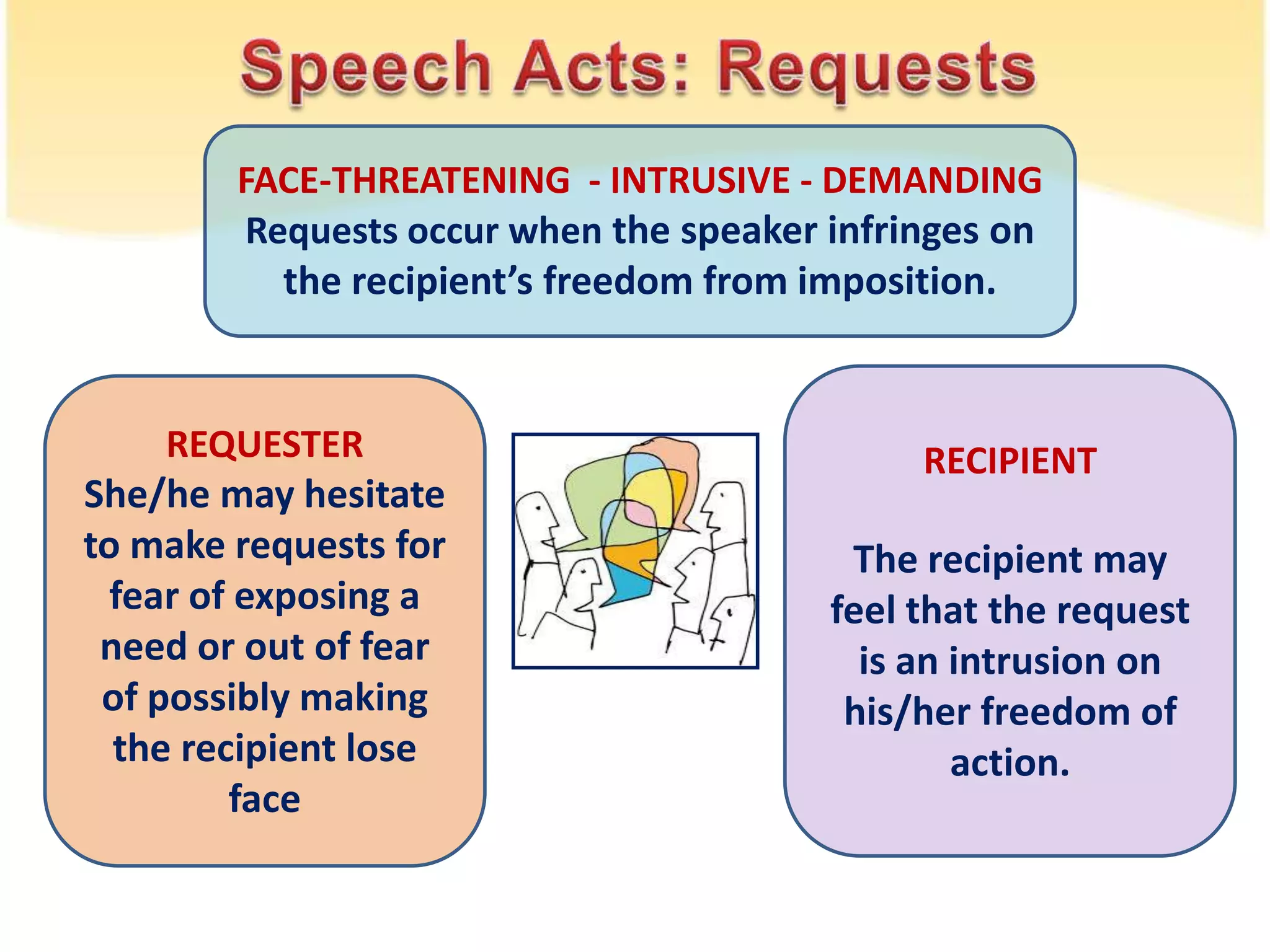 Requests can threaten a recipient's freedom and independence, making them feel imposed upon. Requests range from direct imperatives to indirect hints. Refusals are also often indirect to mitigate face threats. Common refusal strategies include expressing regret, providing excuses or explanations, promising future acceptance, or avoiding a direct refusal. Refusals typically follow a sequence of pre-refusal preparation, the main refusal, and post-refusal justification or conclusion. For example, an employee might hesitate in response to a request to stay late, apologize while explaining an evening plan, and reinforce their inability to stay.