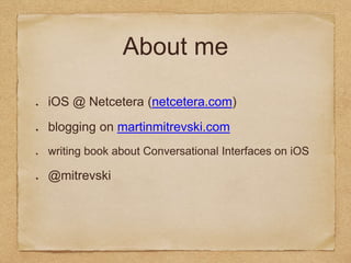 Martin Mitrevski's talk at Mobilization 2017 in Łódź, Poland, focuses on speech analysis techniques, particularly in the context of developing conversational interfaces on iOS. He discusses various NLP concepts such as intent, entities, and context, and provides insights on integrating these techniques into applications. Tools like SiriKit and Dialogflow are highlighted for their roles in enhancing user interactions through speech recognition and intent handling.