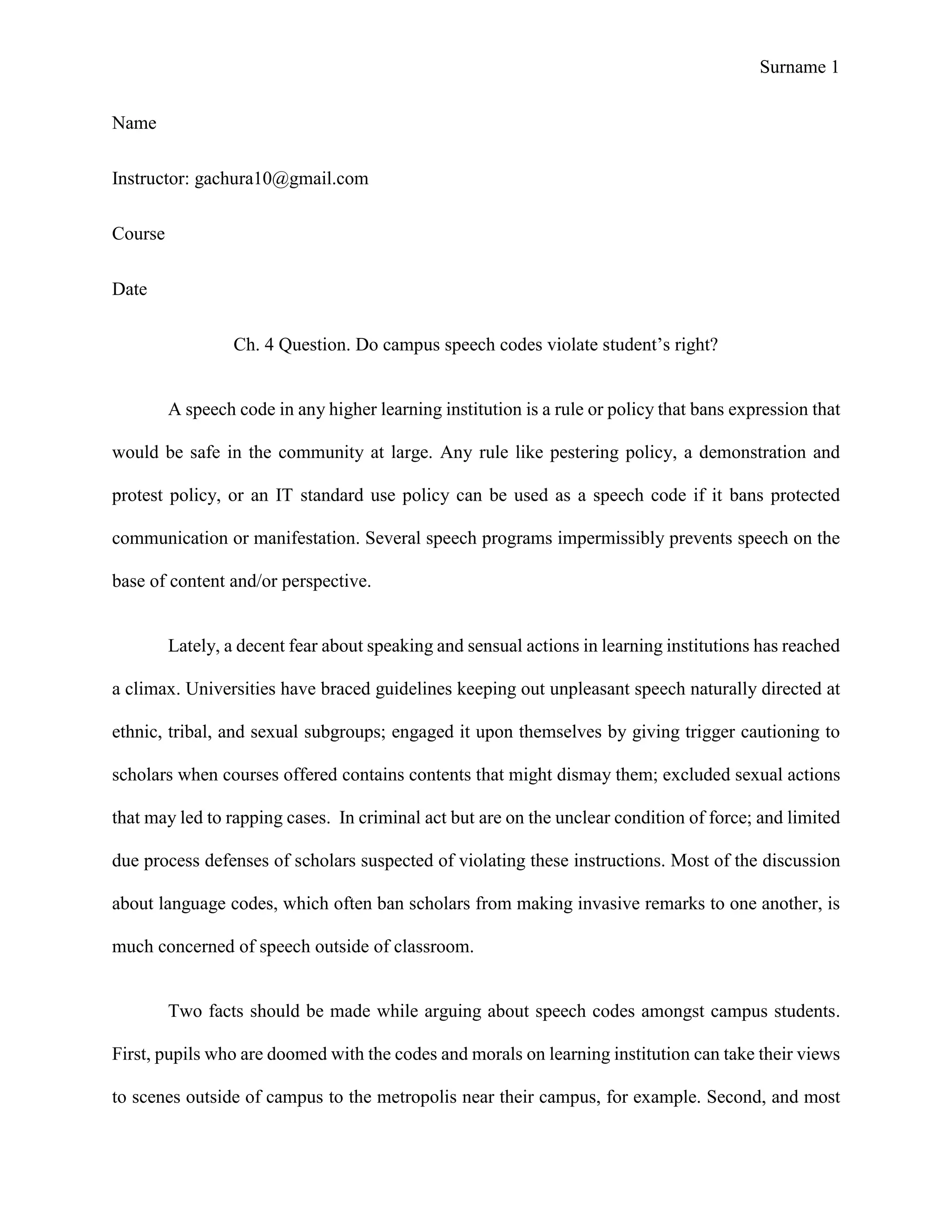 This document discusses campus speech codes and whether they violate students' rights. It notes that speech codes ban expression that would be allowed elsewhere and can restrict protected communication. Several speech codes improperly prevent speech based on its content or viewpoint. While universities have implemented codes to restrict offensive speech targeting groups, debate around speech codes often concerns expression outside the classroom. The document concludes by stating that students can take views outside campus and choose universities with different rules, with public universities bound by the First Amendment.