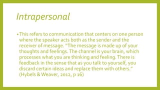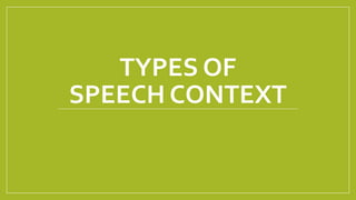 This document defines and provides examples of different contexts and styles of speech. It discusses intrapersonal communication which occurs within one's own thoughts. Interpersonal communication occurs between two or more individuals and can include dyads, small groups, public speaking, and mass communication through media. The document also outlines five speech styles: intimate, casual, consultative, formal, and frozen.