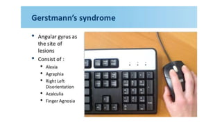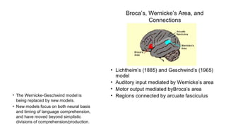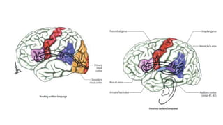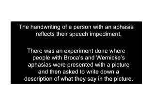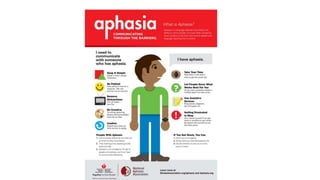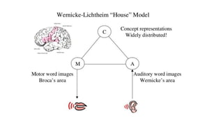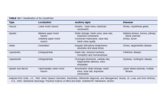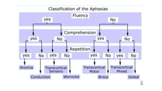 This document discusses speech disorders and their classification. It covers the anatomy and physiology of speech production, different types of speech disorders like aphasia and dysarthria, and their causes and management. Aphasia refers to language impairment due to brain damage and can cause deficits in speaking, comprehension, reading and writing. Dysarthria is defective articulation due to neurological problems, while language functions remain intact. Speech disorders are classified as disorders of language like aphasia or disorders of articulation/voice production.