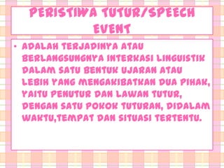Dokumen tersebut membahas tentang peristiwa tutur atau speech event, yang merupakan interaksi linguistik antara dua pihak dalam satu situasi tertentu. Dokumen ini juga menjelaskan delapan komponen yang harus dipenuhi dalam suatu peristiwa tutur menurut Dell Hymes, serta jenis-jenis tindakan tutur dan contohnya.