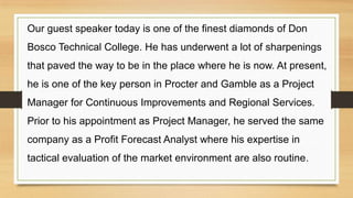 The speaker is a former student and top performer at Don Bosco Technical College who now works as a Project Manager at Procter & Gamble. He earned his bachelor's degree from the University of Santo Tomas, where he graduated cum laude and was a university academic scholar. While in school, he led his team to third place in an investment competition and directed several plays. The document provides guidelines for different types of speeches, including speeches of introduction, presentation, acceptance, and commemoration.