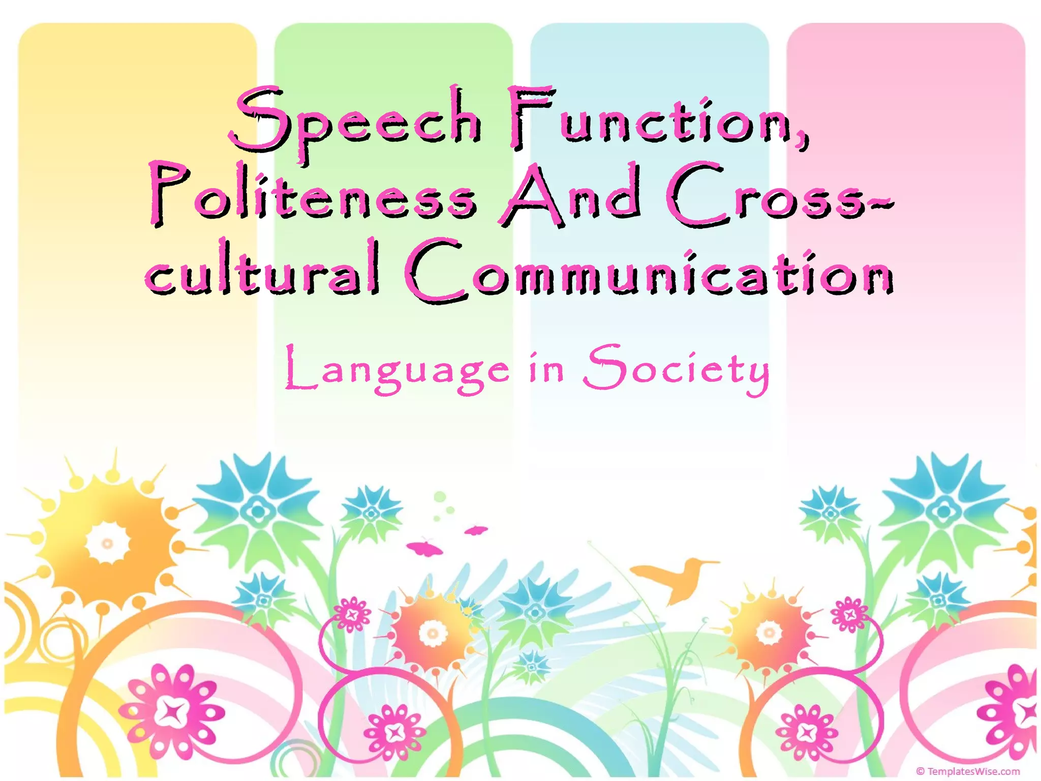 This document discusses speech functions, politeness, and cross-cultural communication. It defines different speech functions such as expressive, directive, referential, metalinguistic, poetic, and phatic utterances. The document also discusses how directives concern getting people to do things and can vary based on social distance, relative status, and formality of context. Politeness also varies across cultures and can be shown through positive and negative politeness as well as different address forms and greetings. Miscommunication may occur between cultures with different assumptions about linguistic politeness.
