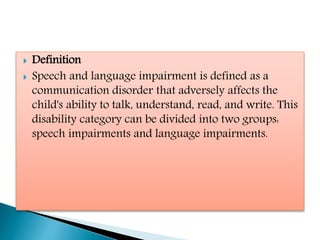 The document defines speech and language impairment as a communication disorder that affects a child's ability to talk, understand, read, and write, categorizing it into speech and language impairments. It outlines the types of speech impairments, such as articulation, fluency, and voice disorders, along with their characteristics and potential causes including neurological issues and physical impairments. Treatment options vary depending on the disorder and may include speech therapy, augmentative communication systems, and psychological support for comorbid conditions like depression.