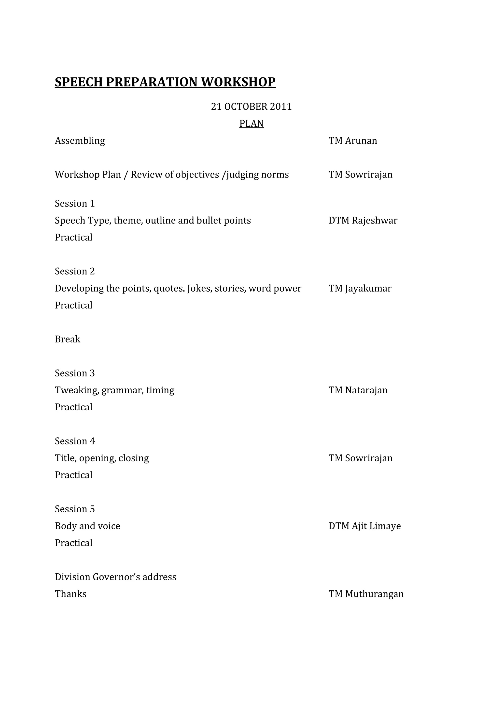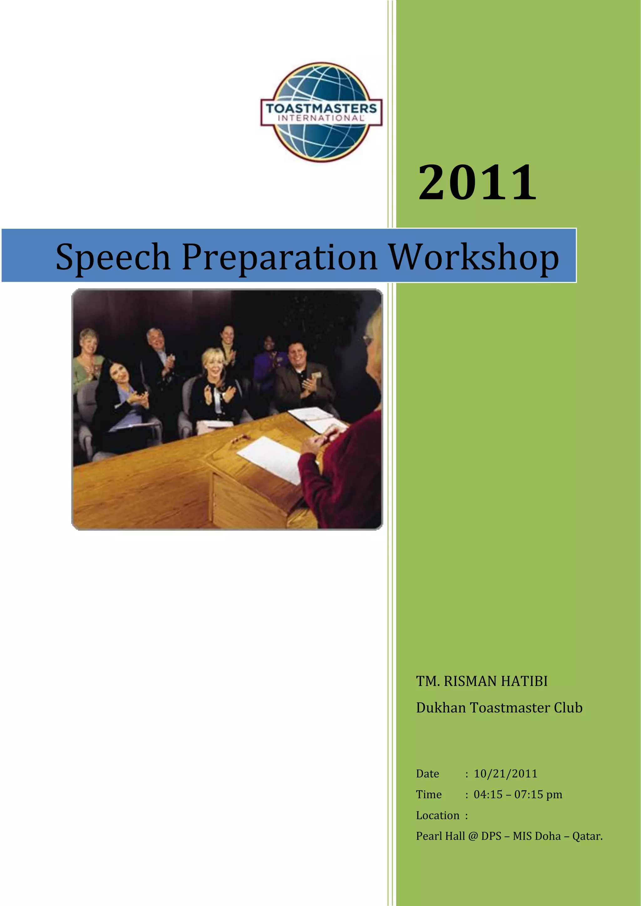 The document outlines the agenda and topics covered during a speech preparation workshop held by the Dukhan Toastmaster Club on October 21, 2011. Key sessions included speech types, theme development, grammar tweaking, effective openings and closings, as well as vocal variety and gestures for impactful delivery. The workshop aimed to enhance participants' public speaking skills and confidence through practical sessions and expert guidance.