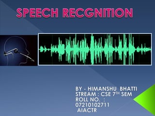 Speech recognition technology decodes acoustic signals into words and can be categorized into speaker independent, speaker dependent, and emerging speaker adaptive models. The process involves several steps, including user voice input, digitization, phonetic breakdown, and statistical modeling to match phonemes to their phonetic representations. Applications range from voice dialing and simple data entry to advanced uses in aircraft cockpits and serving the disabled, with challenges such as speaker variability and channel quality affecting accuracy.