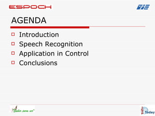 Hugo Moreno discusses speech recognition and its applications in control. Speech recognition is the process of converting speech signals to sequences of words through computer algorithms. It involves feature extraction from speech and matching patterns to vocabularies. Speech recognition can be used for applications like elevator control, robot control, translation, stress monitoring, and hands-free computing. It provides an acceptable level of accuracy but improving accuracy reduces speed. Speech recognition involves matching voice patterns to acquire or provide vocabularies.