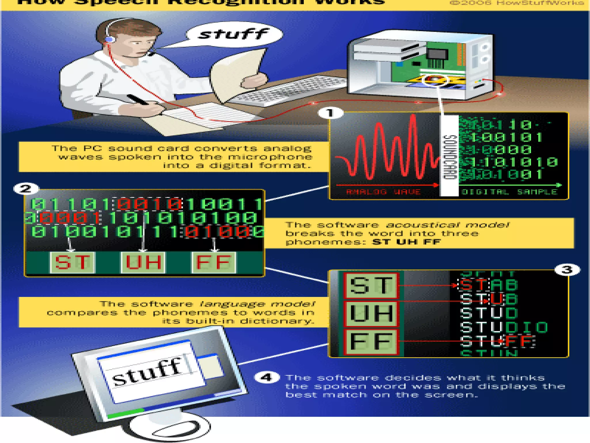 Speech recognition, also known as automatic speech recognition or computer speech recognition, allows computers to understand human voice. It has various applications such as dictation, system control/navigation, and commercial/industrial uses. The process involves converting analog audio of speech into digital format, then using acoustic and language models to analyze the speech and output text. There are two main types: speaker-dependent which requires training a model for each user, and speaker-independent which can recognize any voice without training. Accuracy is improving over time as technology advances.