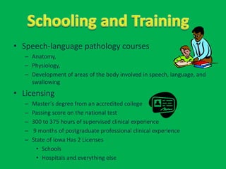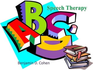 Benjamin D. Cohen is a speech-language pathologist. To become licensed, one must complete a master's degree from an accredited program including courses in anatomy, physiology, and speech development. Candidates must also pass a national exam, complete 300-375 hours of supervised clinical experience, and 9 months of postgraduate clinical work. Speech-language pathologists work in hospitals, nursing facilities, schools, and private practices helping people with conditions like cleft palate, stuttering, childhood language delays, and speech or swallowing issues from medical conditions. The highest paying work includes nursing facilities and home health care services.