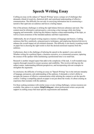 The document discusses the multifaceted challenges of speech writing, emphasizing the need for creativity, rhetorical skill, and audience awareness to convey a compelling message. It highlights the importance of balancing informative content with engaging delivery, while also addressing the complexities of language mastery and research. Additionally, it touches on other themes such as mindfulness practice, ancient maritime trade, and personal reflections, illustrating various writing styles and subjects.