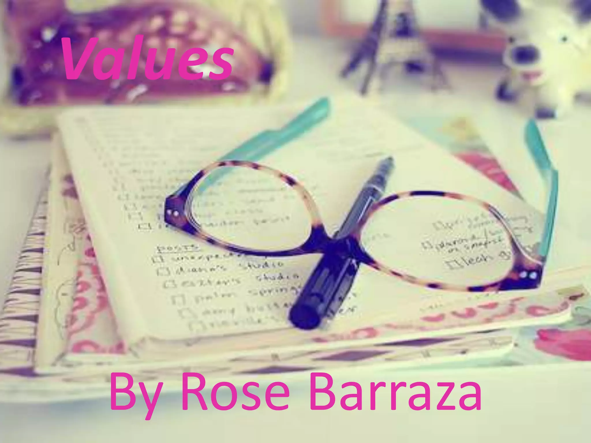 Rose Barraza values her family greatly because they have always supported her and encouraged her to complete her education. She also highly values education and knowledge, having struggled through community college but applying to a four-year university. Additional values she discusses include happiness, ambition, independence, responsibility, honesty, love, and learning to make important decisions through reflecting on different perspectives. The document is a slideshow where she explains several values that are important to her and how they influence her decisions and life.