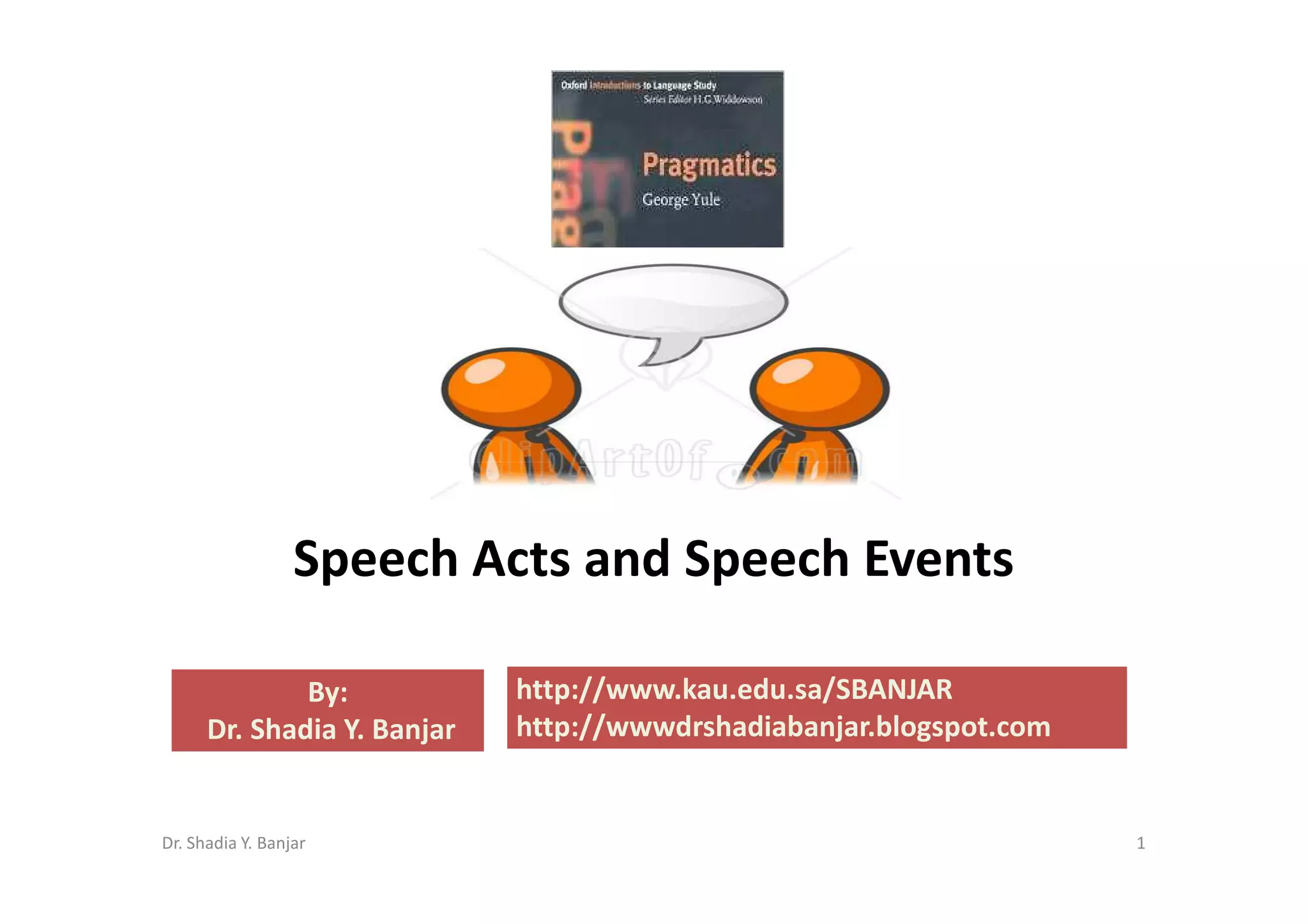 The document discusses speech acts and speech events. It defines speech acts as functional units of language at the utterance level, such as thanking or requesting. Speech events are larger units involving multiple turns between participants, like a job interview. The document also discusses illocutionary force indicating devices, felicity conditions, performatives, and John Searle's classification of five general types of speech acts: declarations, representatives, expressives, directives, and commissives.
