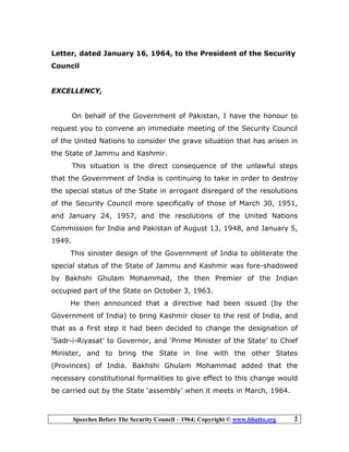 This document is a letter from the Government of Pakistan to the President of the UN Security Council requesting an immediate meeting to discuss the situation in Jammu and Kashmir. It summarizes recent actions by the Government of India that violate UN resolutions protecting the special autonomous status of Jammu and Kashmir, including changing titles of government positions, appointing more Hindu ministers, and purging Muslim officers. The letter argues these actions are part of India's plan to annex Jammu and Kashmir against the will of the people and in violation of their right to self-determination as affirmed in UN resolutions.