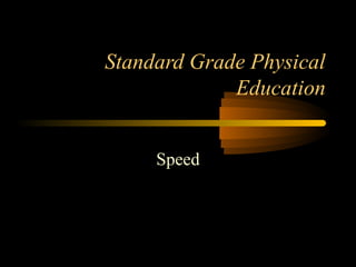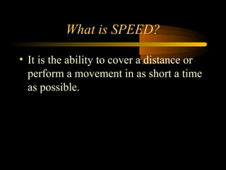 Speed refers to the ability to cover a distance or perform a movement in as short a time as possible. Reaction time is the length of time it takes to respond to a stimulus, such as the sound of a starting gun. Running speed depends on factors like range of movement in joints, muscle strength, stride length and frequency, correct technique, and force exerted by the leading leg. Speed can be improved through strength training to strengthen leg muscles, and a combination of aerobic and anaerobic exercises to increase muscular endurance and ability to cope with lactic acid buildup.
