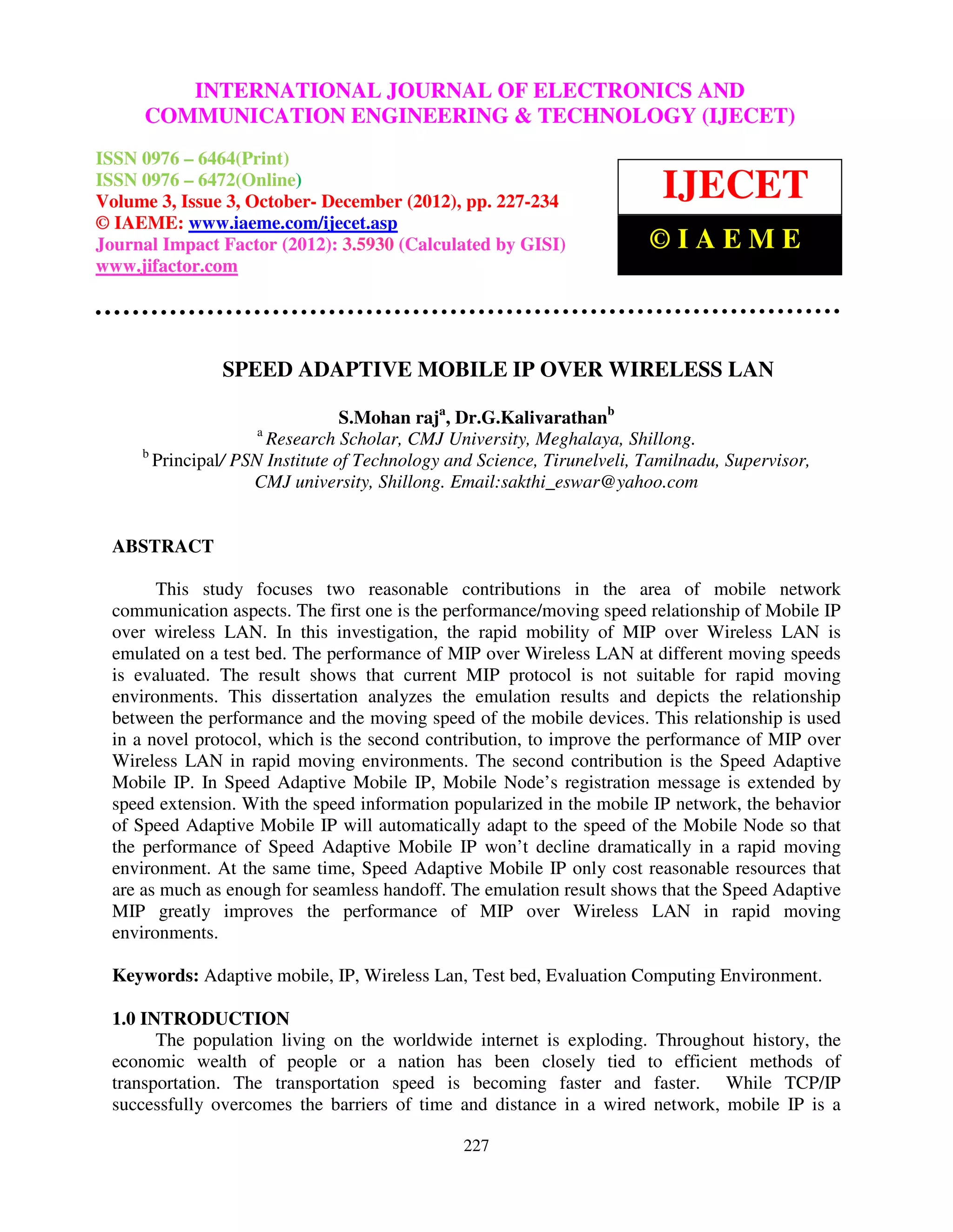 This document discusses speed adaptive mobile IP over wireless LAN. It first analyzes the relationship between performance and moving speed for mobile IP over wireless LAN, showing that current mobile IP is not suitable for rapid movement. It then proposes a speed adaptive mobile IP protocol that extends registration messages with speed information to allow the network behavior to automatically adapt based on node speed, improving performance for rapid movement without high resource costs. The protocol is emulated and shown to greatly improve mobile IP performance for rapid movement over wireless LAN.