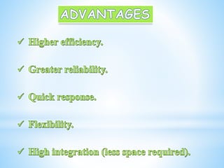 This document discusses a project to control the speed of a DC motor using a microcontroller and pulse width modulation. Specifically, it aims to vary the speed-torque relationship of a DC motor electronically using a microcontroller to generate high and low pulses that control motor speed. Pulse width modulation is identified as a technique that can be used to simulate variable voltages through variations in pulse width to achieve variable analog speed control. The document outlines the components used, including an H-bridge circuit and microcontroller, and discusses some limitations such as susceptibility to electromagnetic interference.