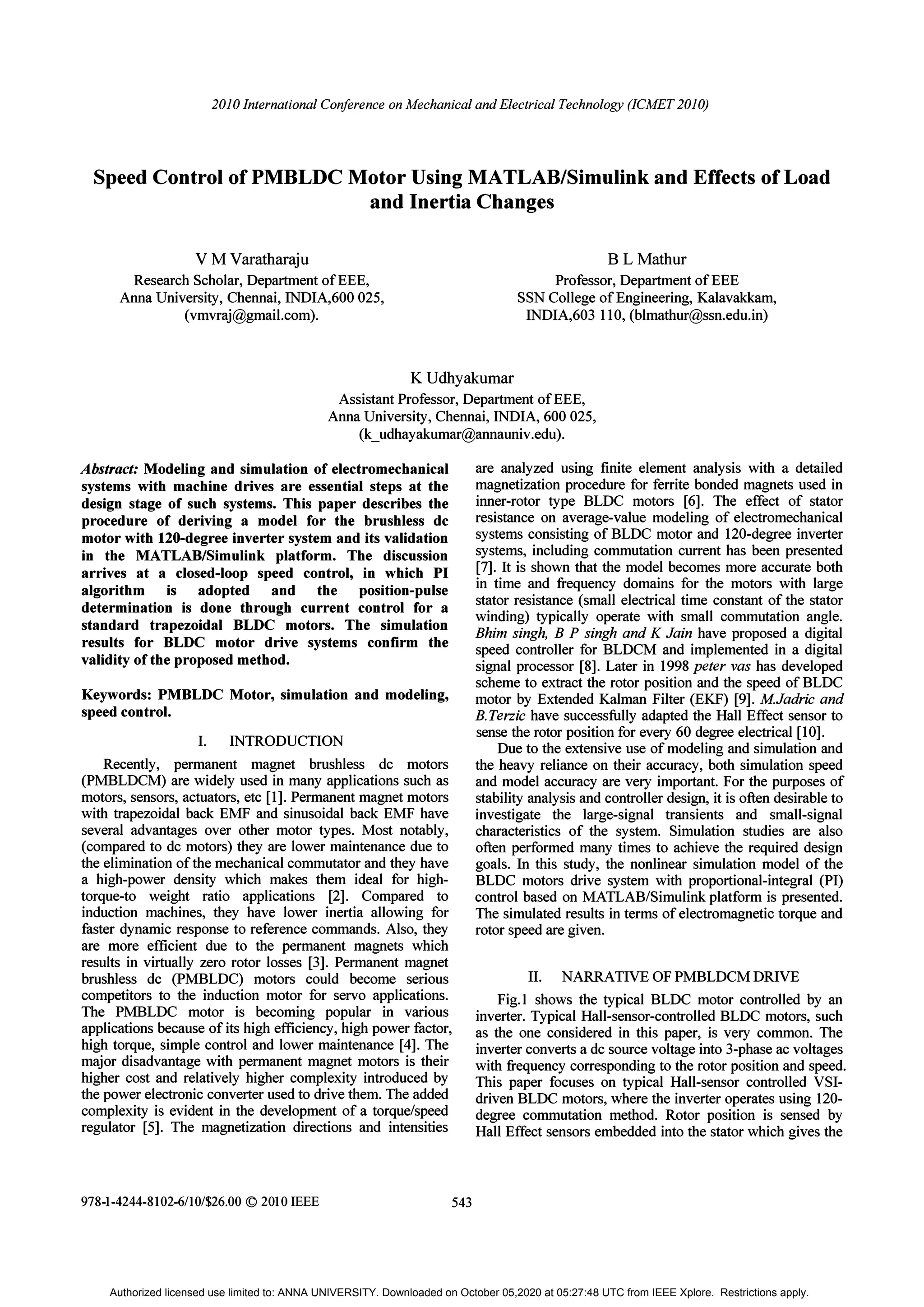This document describes a study on modeling and simulating a permanent magnet brushless DC (PMBLDC) motor drive system in MATLAB/Simulink. The authors develop a model of a PMBLDC motor with a 120-degree inverter system and implement closed-loop speed control using a PI controller. Simulation results confirm the validity of the model and controller. The paper examines the effects of load and inertia changes on the motor's speed performance.