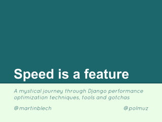 This document discusses techniques for optimizing Django application performance, including gathering performance data with tools like New Relic and Google Analytics, fixing database bottlenecks through indexing and query optimization, offloading CPU intensive tasks through Celery, caching at different levels like the template, view, and cache API levels, optimizing front-end performance through asset compression and loading, and dealing with cache invalidation issues. Examples and references are provided for each technique.