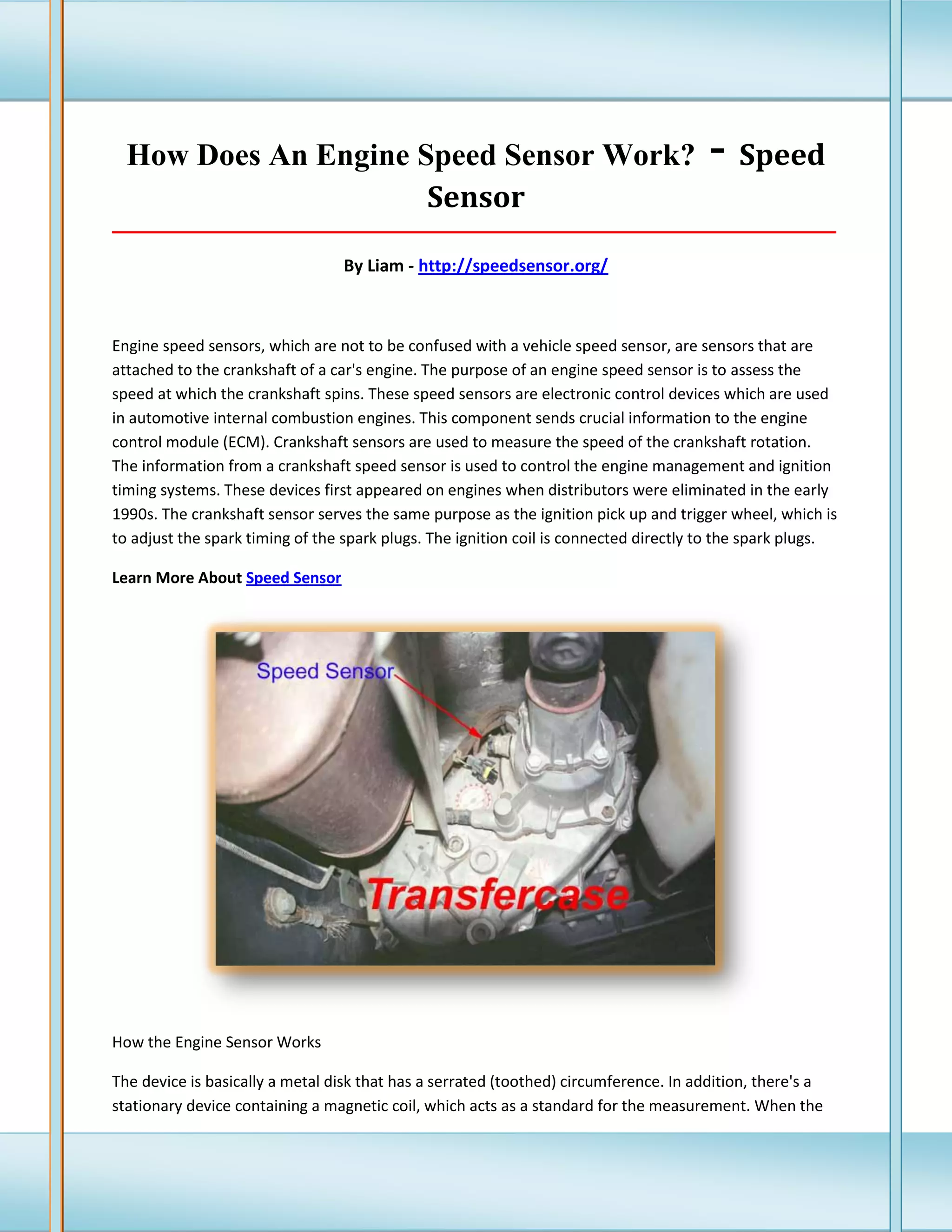 Engine speed sensors, attached to a car's crankshaft, measure the crankshaft's rotation speed and send data to the engine control module (ECM) for engine management. These sensors use either magnetic or hall effect technology to generate signals that inform the ECM of the engine's RPM and timing. First introduced in the early 1990s, they replace traditional ignition systems by controlling spark timing based on crankshaft speed measurements.