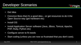 The document presents an introduction to Platform as a Service (PaaS) and OpenShift for developers, focusing on streamlining software development with open-source technologies. It outlines the developer workflow, the role of DevOps in enhancing collaboration and automation, and provides a quick guide to using OpenShift, including application creation and continuous integration with Jenkins. Additionally, it highlights the benefits of containers over traditional virtual machines and offers resources for getting started with OpenShift.