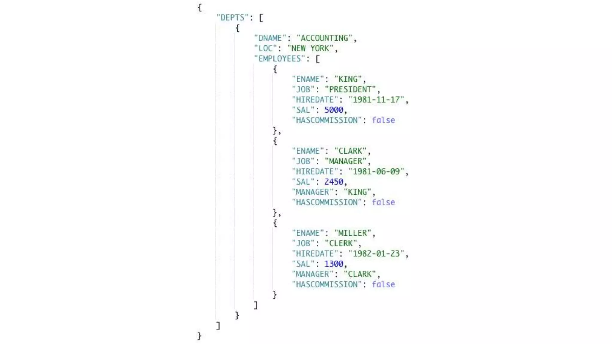 What about JSON format? On the right side you can see sample JSON object that consists of employees from one department.