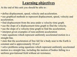 The document provides learning objectives and concepts related to kinematics including displacement, speed, velocity, acceleration, and equations of motion. The key points are: