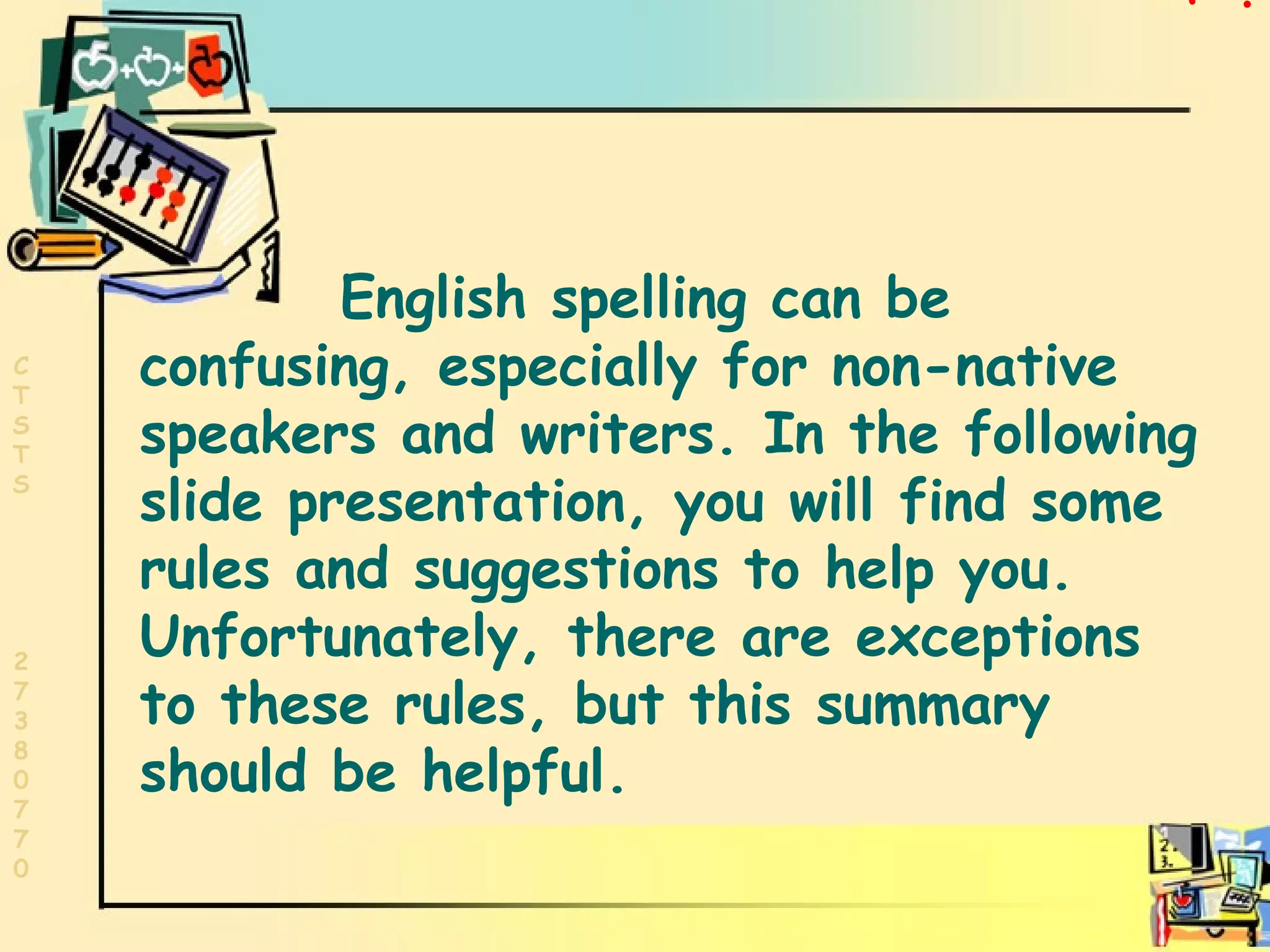 This document provides rules and exceptions for English spelling. It discusses doubling consonants when adding suffixes to words ending in vowels, changing 'y' to 'i' when adding suffixes, dropping silent 'e's and exceptions. It also covers forming plurals, adding prefixes, and exceptions for one or two syllable words and words ending in two vowels. The document encourages writing practice and using spell checkers or dictionaries for questions.