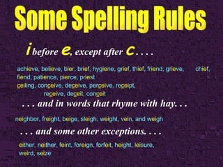 i before e , except after c . . . . ach ie ve, bel ie ve, b ie r, br ie f, hyg ie ne, gr ie f, th ie f, fr ie nd, gr ie ve, ch ie f, f ie nd, pat ie nce, p ie rce, pr ie st c ei ling, con c ei ve, de c ei ve, per c ei ve, re c ei pt, re c ei ve, de c ei t, con c ei t . . . and in words that rhyme with hay. . . n ei ghbor, fr ei ght, b ei ge, sl ei gh, w ei ght, v ei n, and w ei gh . . . and some other exceptions. . . . ei ther, n ei ther, f ei nt, for ei gn, forf ei t, h ei ght, l ei sure, w ei rd, s ei ze