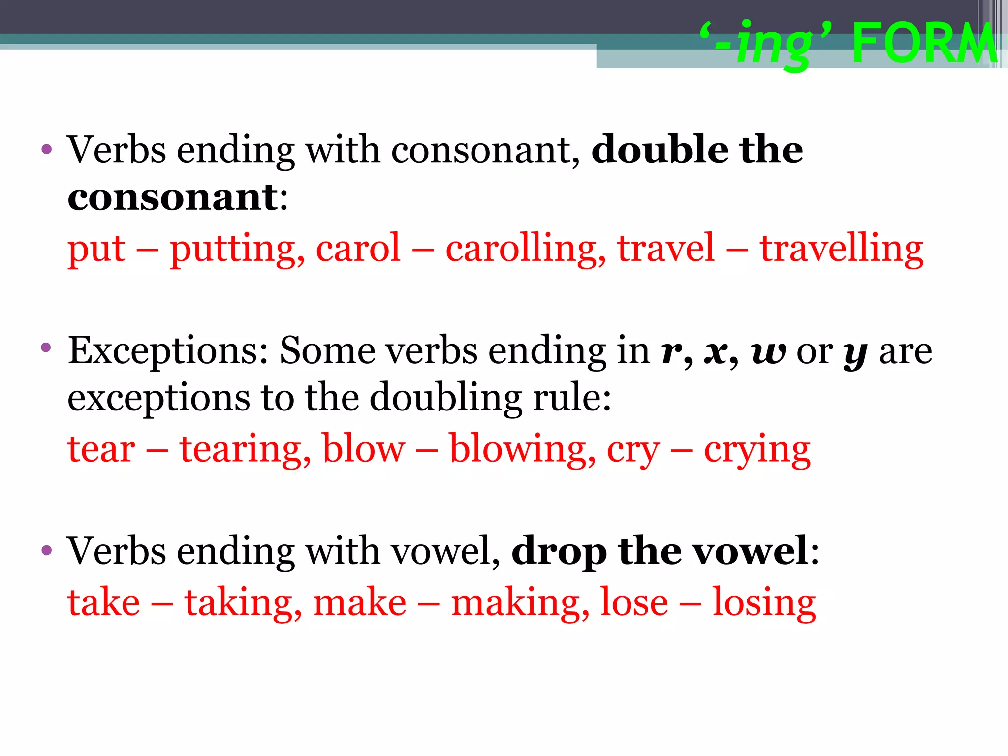 [1] For '-ing' form, it discusses doubling consonants, dropping vowels, and changing 'ie' to 'y'. [2] For past form, it covers regular verbs with 'ed', dropping 'y' and adding 'i+ed', and doubling final consonants. [3] For third person present simple, it explains adding 'es' or 's' after the verb.