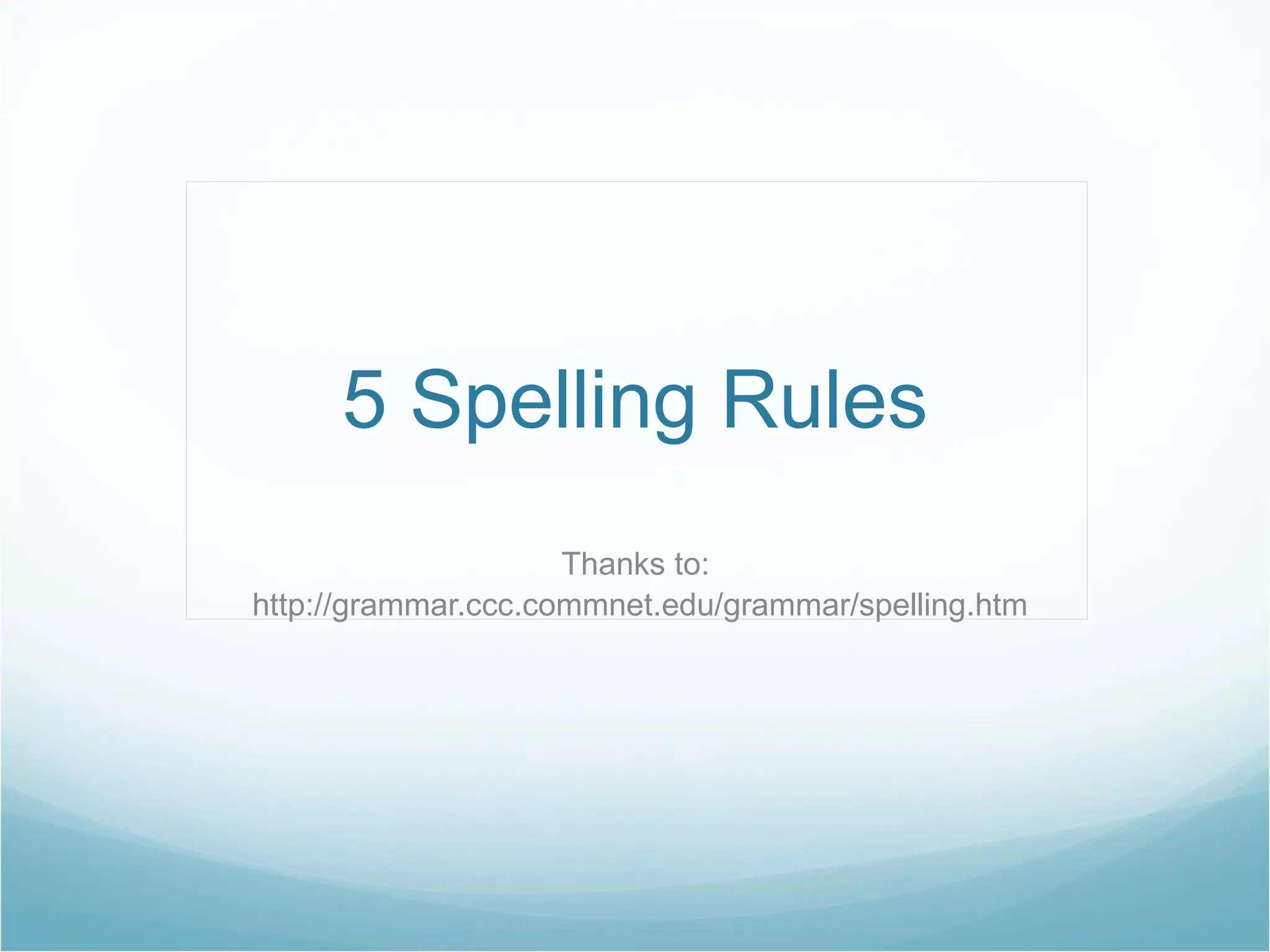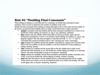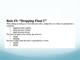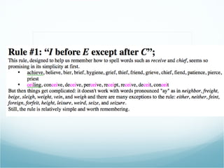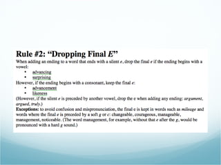 Spelling rules can help improve your spelling abilities. Some important rules include doubling consonants after short vowels, dropping silent e's when adding suffixes beginning with vowels, and checking exceptions to rules with a dictionary. Mastering a few basic spelling rules can go a long way in enhancing your skills.