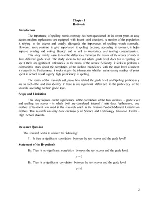 This study investigates the correlation between grade level and spelling proficiency among selected high school students at the Science and Technology Education Center. Using a 15-item spelling test administered to 40 students, the results indicate a significant positive correlation, suggesting that higher grade levels are associated with better spelling proficiency. The study concludes that while there is a mild direct correlation, further research is recommended to explore additional factors influencing spelling skills.