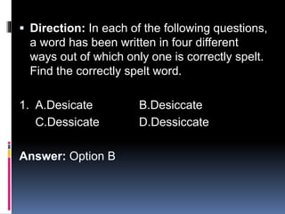 The document presents a spelling quiz where participants must identify the correctly spelled words among four options for each question. It includes a total of nine questions, with the correct answers provided. The content is directed towards improving spelling skills.