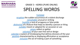 The document contains 5 days worth of spelling words for a Grade 5 class in Korea. Monday's words include abandon, ability, and absence. Tuesday's words include eruption, remarkable, humility, distinctive, and suitable. Wednesday's words include behavior, conclude, Amazon, dedicate, condone, reliable, faulty, register, and degree. Thursday's words include transfixed, concoct, radical, steadily, defiant, mandate, default, outlier, and Dixieland. Friday's words include primitive, contrary, assemble, amigo, huddled, enact, profane, fauna, flora, and formula.