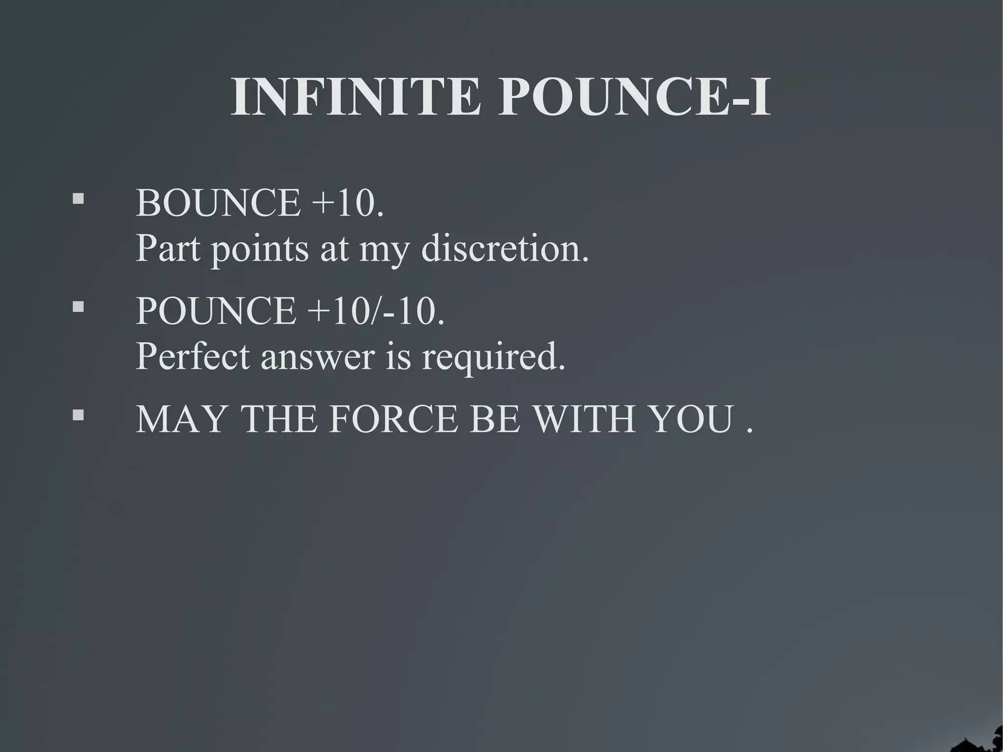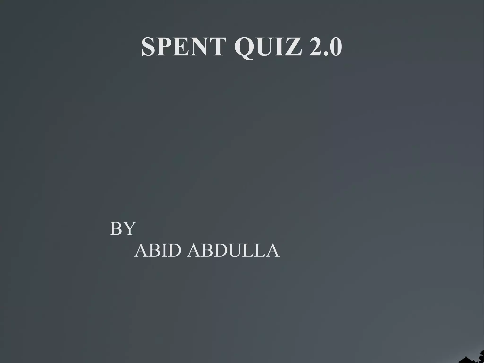 SPENT QUIZ 2.0 is a quiz with 10 questions on various topics ranging from identifying people, movies, sports and more. The questions have point values for correct and incorrect answers ranging from +10/-10 to +120/-60. The quiz is hosted by Abid Abdulla from Infinite Pounce-I.