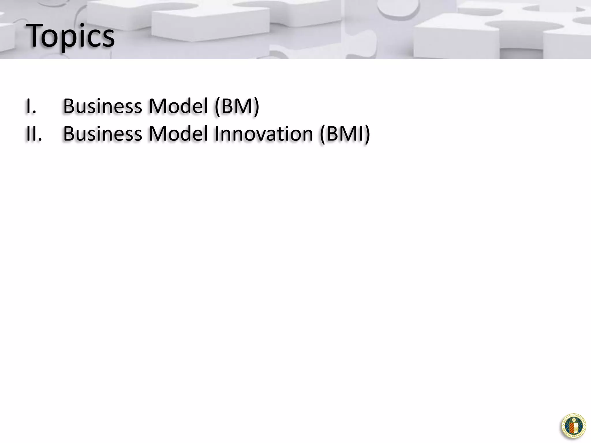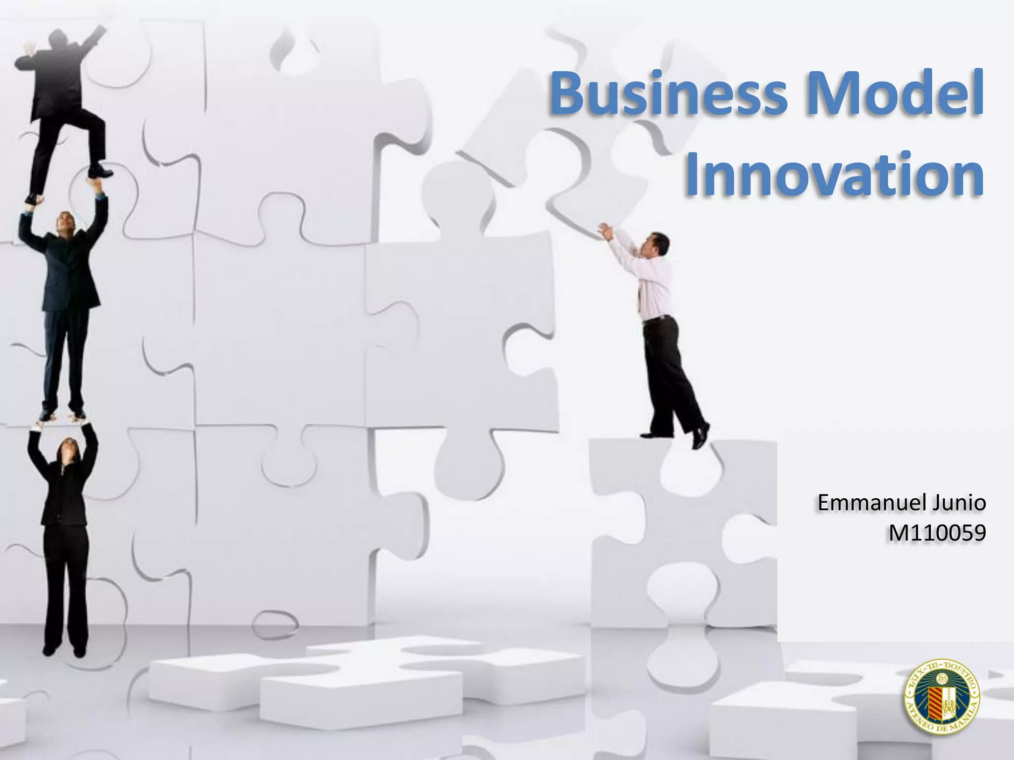This document discusses business models and business model innovation. It begins by defining a business model as describing how an organization creates, delivers, and captures value. It then introduces the business model canvas as a tool to systematically describe and design business models using nine building blocks. The document explains common business model patterns and provides examples. It defines business model innovation as envisioning and implementing new ways of doing business to create customer value and competitive advantage. The document outlines a four step process for business model innovation: initiation, ideation, integration, and implementation. It emphasizes that innovation often involves adapting existing business model patterns rather than completely new ideas.