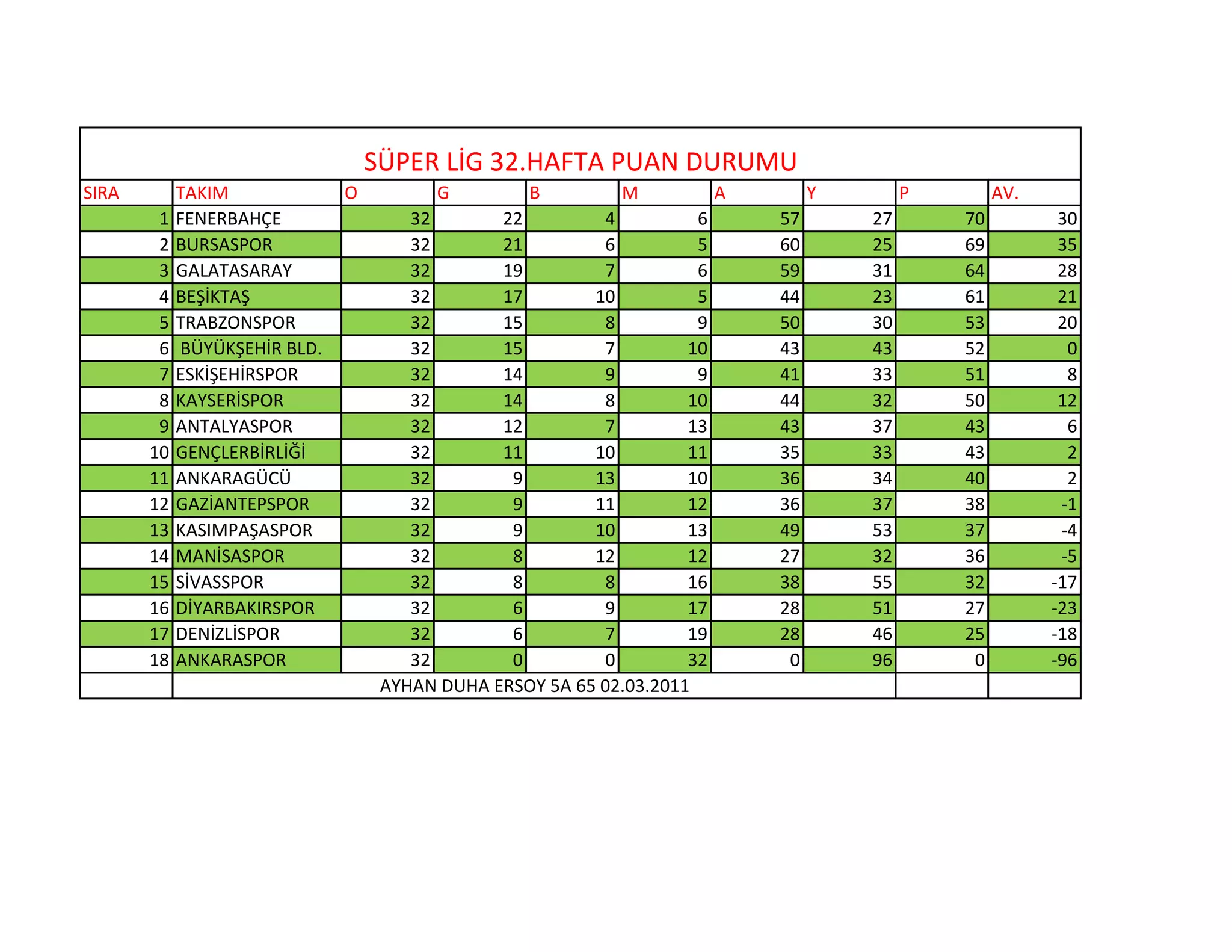 Süper lig 32. Hafta Puan Tablosu XLSX
