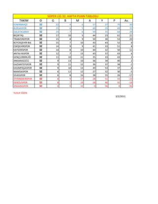 HAFTA PUAN TABLOSU TAKIM O G B M A Y P Av. FENERBAHÇE 32 22 4 6 57 27 70 30 BURSASPOR 32 21 6 5 60 25 69 35 GALATASARAY 32 19 7 6 59 31 64 28 BEŞİKTAŞ 32 17 10 5 44 23 61 21 TRABZONSPOR 32 15 8 9 50 30 53 20 BÜYÜKŞEHİR Bld. 32 15 7 10 43 43 52 0 ESKİŞEHİRSPOR 32 14 9 9 41 33 51 8 KAYSERİSPOR 32 14 8 10 44 32 50 12 ANTALYASPOR 32 12 7 13 43 37 43 6 GENÇLERBİRLİĞİ 32 11 10 11 35 33 43 2 ANKARAGÜCÜ 32 9 13 10 36 34 40 2 GAZİANTEPSPOR 32 9 11 12 36 37 38 -1 KASIMPAŞASPOR 32 9 10 13 49 53 37 -4 MANİSASPOR 32 6 12 12 27 32 30 -5 SİVASSPOR 32 6 8 16 38 55 26 -17 DİYARBAKIRSPOR 32 8 9 17 28 51 33 -23 DENİZLİSPOR 32 8 7 19 28 46 31 -18 ANKARASPOR 32 0 0 32 0 96 0 -96 YUSUF ÖZEN 3/2/2011